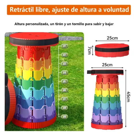 Taburete plegable, portátil y retráctil, diseñado con resistencia y una superficie antideslizante para brindar comodidad y seguridad en cualquier lugar.