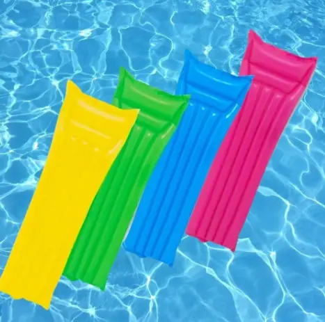 Características:Fabricado en vinilo resistente.Almohada incorporada de 2 cámaras.Contiene válvula de seguridad.Colores: Celeste, verde y rosadoMedidas: 1,83 x 0,70 mts.