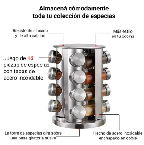 Llevá el arte del orden a tu cocina con este elegante especiero giratorio de 16 frascos. Diseñado para optimizar espacio y mejorar la experiencia gastronómica, cuenta con una base giratoria 360° que permite acceder fácilmente a cada condimento sin mover todo el set. Los frascos de vidrio, tapas metálicas y estructura en acero inoxidable garantizan durabilidad, higiene y estilo. Es el compañero perfecto para tener tus hierbas y especias siempre visibles, frescas y organizadas.