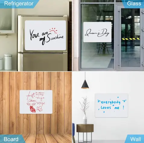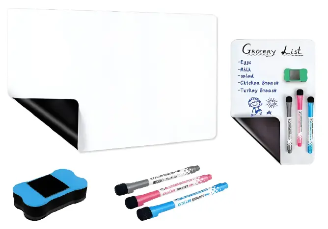 Incluye uno o más bolígrafos para que puedas escribir notas, recordatorios, listas de compras o mensajes, y borrarlos con facilidad. Ideal para la cocina o lugares comunes de la casa donde la comunicación rápida ayuda en el día a día.