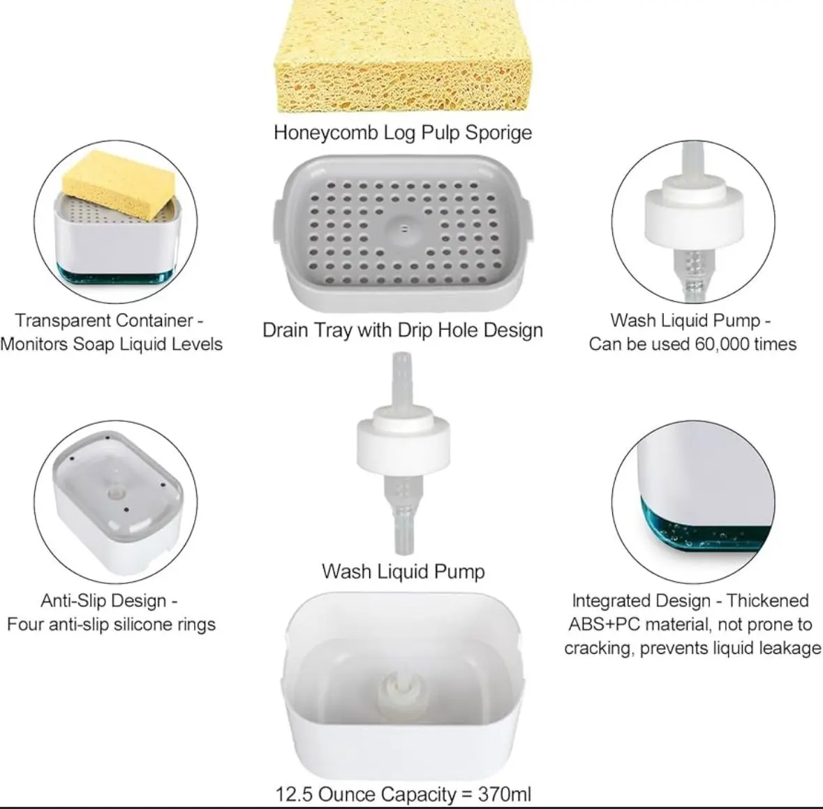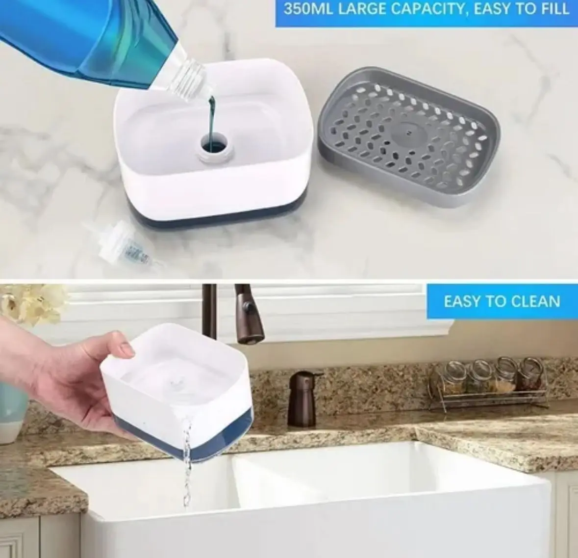 Práctico y moderno, combina dispensador de 350 ml y espacio para esponja en un diseño compacto que mantiene la encimera ordenada. Su base inclinada con drenaje evita acumulación de agua y malos olores, mientras que la bomba dosificadora ahorra jabón.