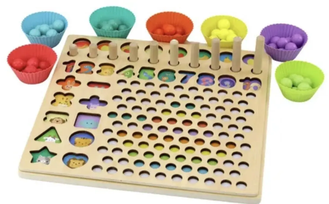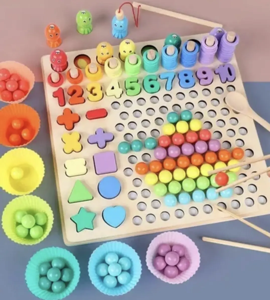 Juego educativo que combina números del 1 al 10, colores y formas para desarrollar motricidad fina, coordinación y pensamiento lógico. Incluye cuentas, aros, figuras geométricas, palillos y cucharas de madera. Ideal para niños desde 36 meses en casa o centros educativos.